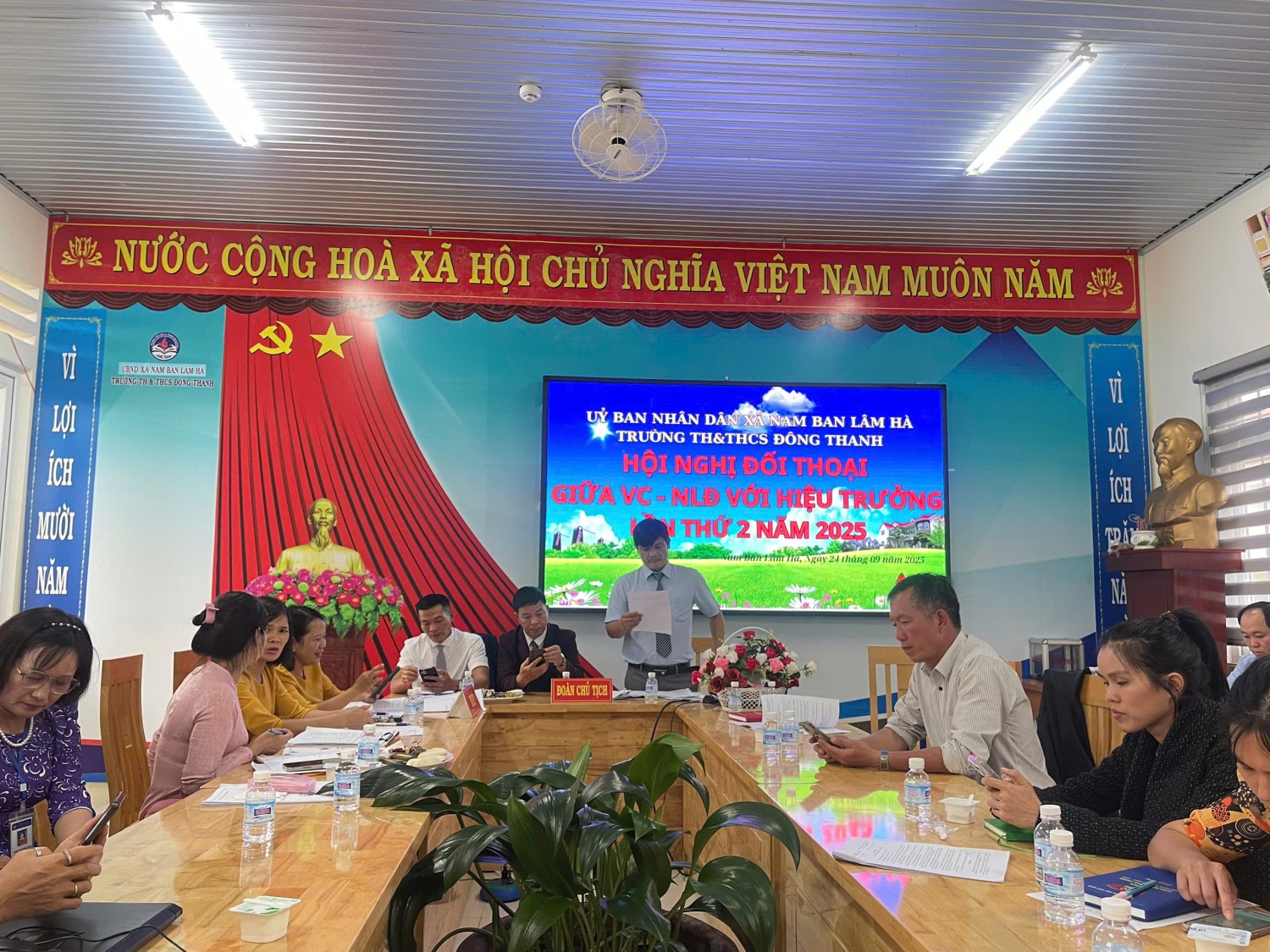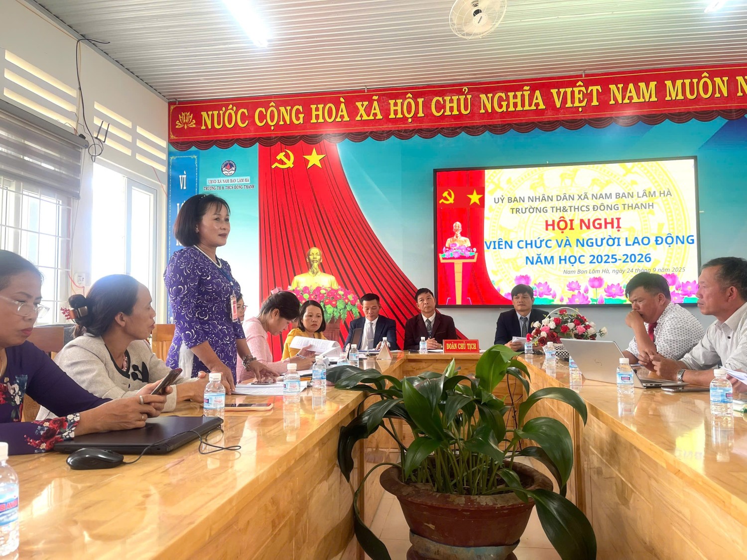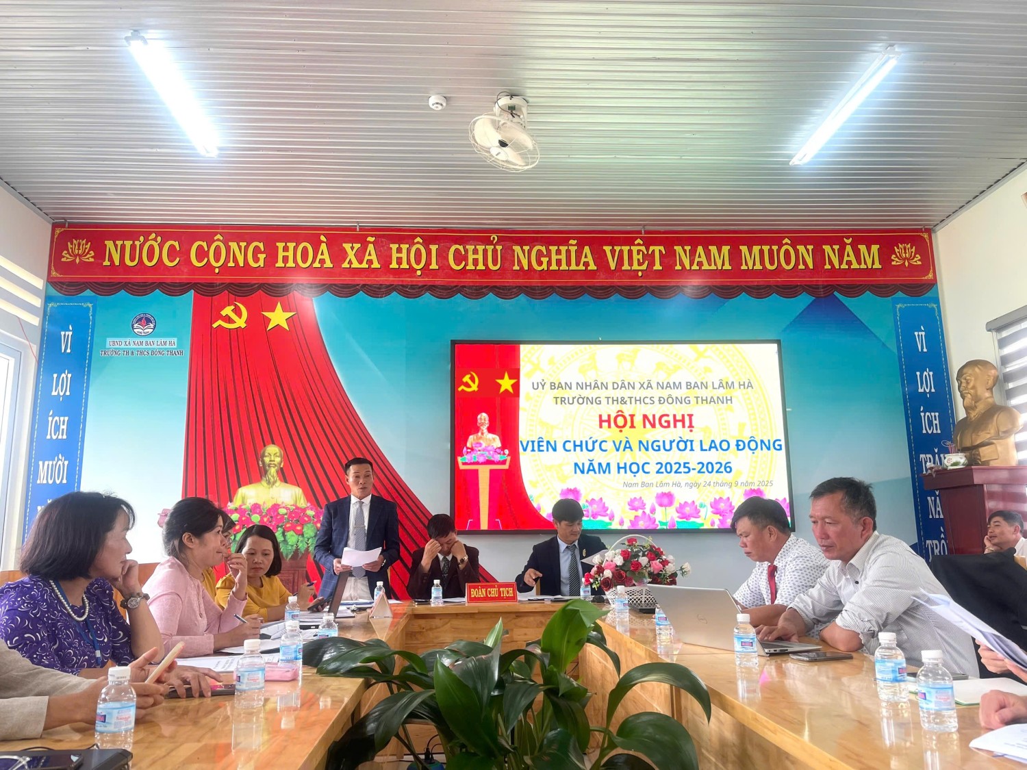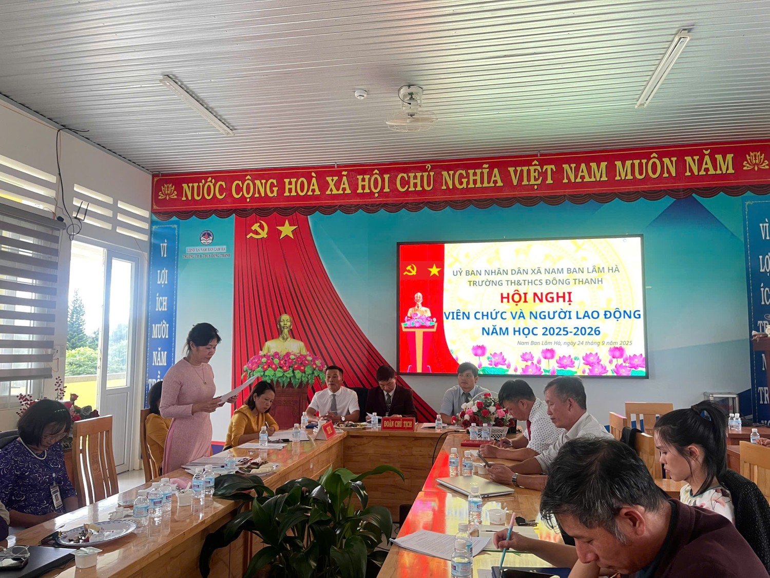 Thực hiện hướng dẫn của Sở Giáo dục và Đào tạo tỉnh Lâm Đồng, ngày 24 tháng 9 năm 2025, Trường TH&THCS Đông Thanh long trọng tổ chức Hội nghị Viên chức và Người lao động năm học 2025-2026. Đây là hoạt động thường niên có ý nghĩa quan trọng, nhằm phát huy quyền làm chủ của tập thể cán bộ, giáo viên, nhân viên; đồng thời đánh giá, kiểm điểm kết quả thực hiện nhiệm vụ năm học trước và đề ra phương hướng, giải pháp cho năm học mới.